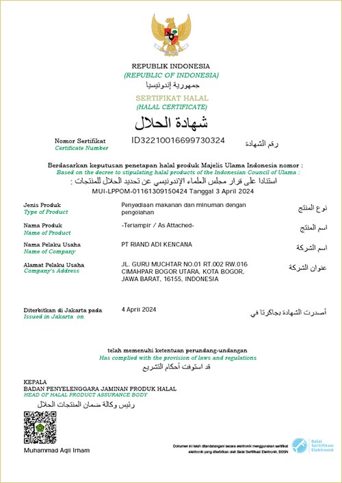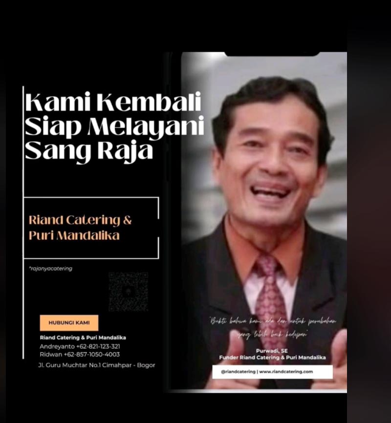 Riand Catering adalah sebuah Perusahan yang bergerak di bidang Food Service yang beralamat di JL. Guru Muchtar NO.01 Cimahpar Bogor Utara Kota Bogor, Riand Catering hadir sebagai salah satu perusahaan Food Service di JABODETABEK ber-mitra bisnis dalam memenuhi permintaan Catering. diantaranya catering Government, Catering Corporate, Catering industri, Wedding dan Event Public maupun individual event dengan layanan berkualitas serta didukung oleh SDM